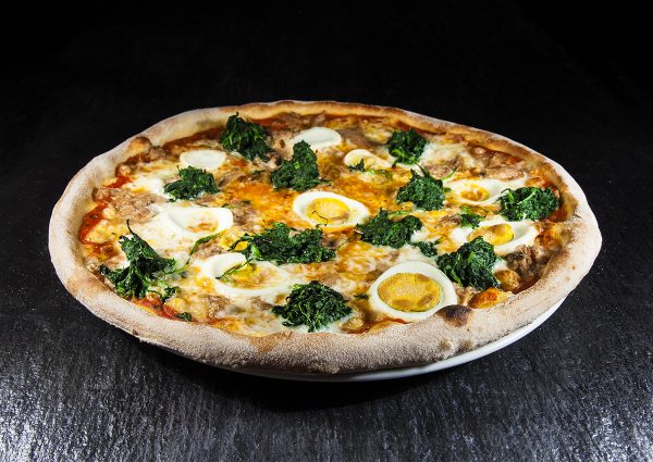 Zutaten: Tomatensauce, Mozzarella – Fior di Latte, Thunfisch, Ei, Spinat